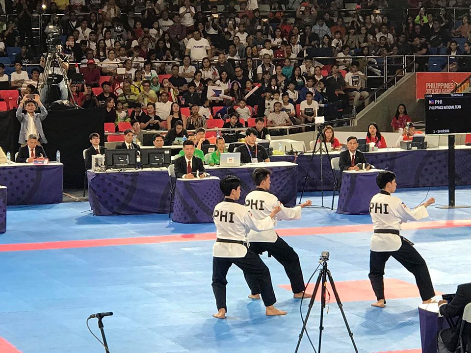 It was poomsae day for taekwondo. More like demo demo and not combat (which is called kumite). They had individual recognized poomsae when we got there. The Filipina won the gold. Then they had group recognized poomsae where the men's team won gold.